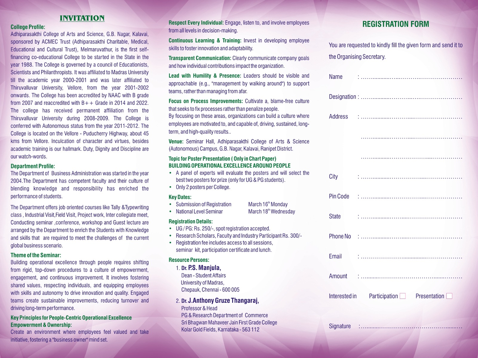 The Department of Business Administration at Adhiparasakthi College of Arts and Science, G.B. Nagar, Kalavai, is organizing the "National Seminar on Building Operational Excellence Around People - (BOEAP-26)" on 18th March 2026.